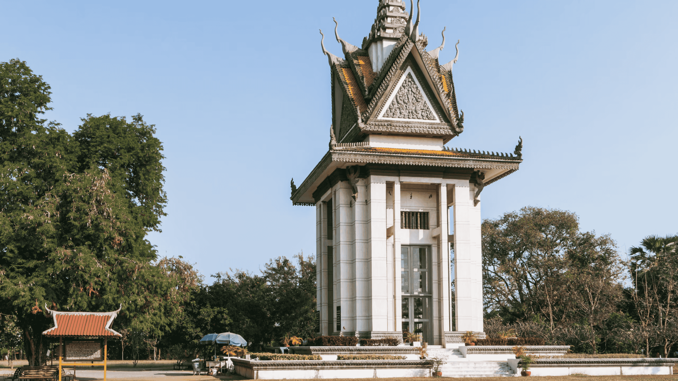 The Choeung Ek Genocidal Center, situated about 17 kilometers from Phnom Penh, Cambodia, is one of the most harrowing reminders of the Khmer Rouge regime's brutality. Between 1975 and 1979, this former orchard was transformed into one of the many "Killing Fields," where over 17,000 men, women, and children were executed and buried in mass graves. The site now stands as a memorial to the victims of this genocide.