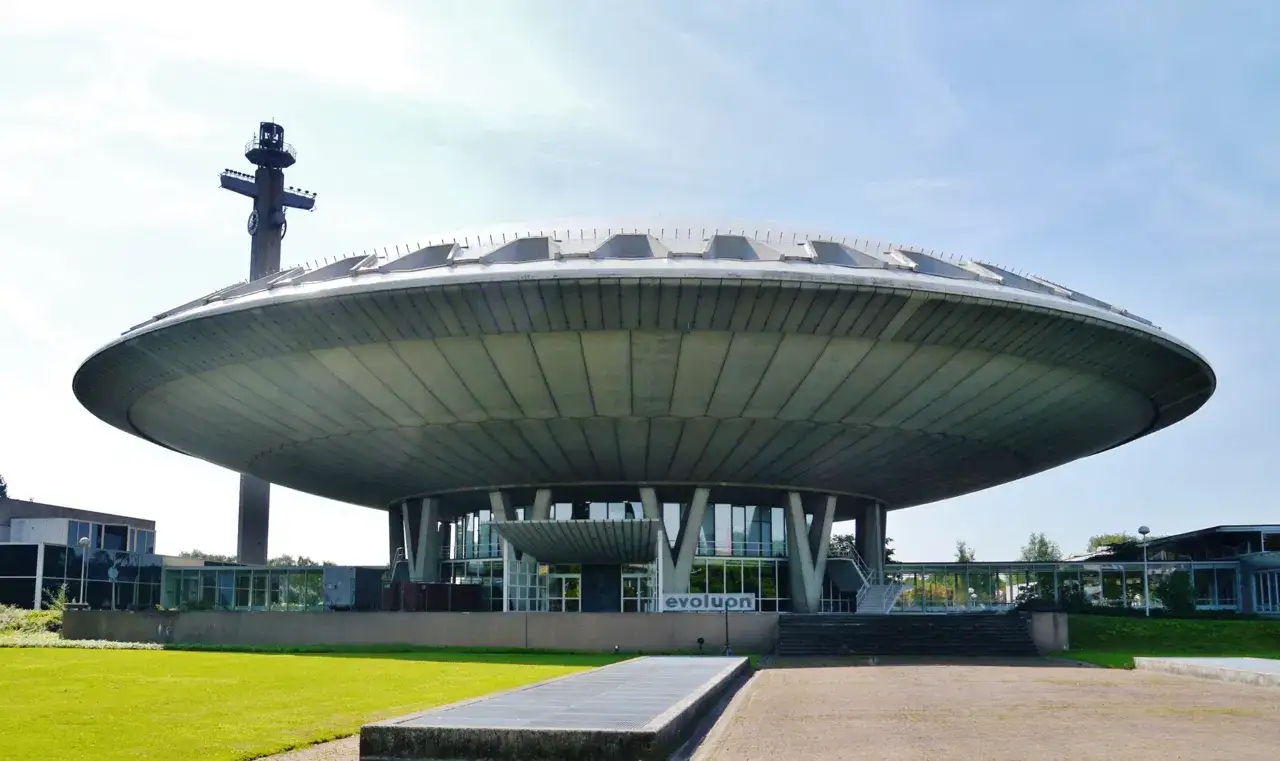 The flying saucer design of Evoluon is itself a point of interest. Originally conceived during the optimistic Space Age, it reflects a vision of the future. Designed by Louis Kalff and inspired by the scientific innovations of its time, the structure remains a timeless example of modern architecture. Visitors are encouraged to walk around the exterior and appreciate the sweeping lines, the massive dome, and the way it seems to float above the landscape.