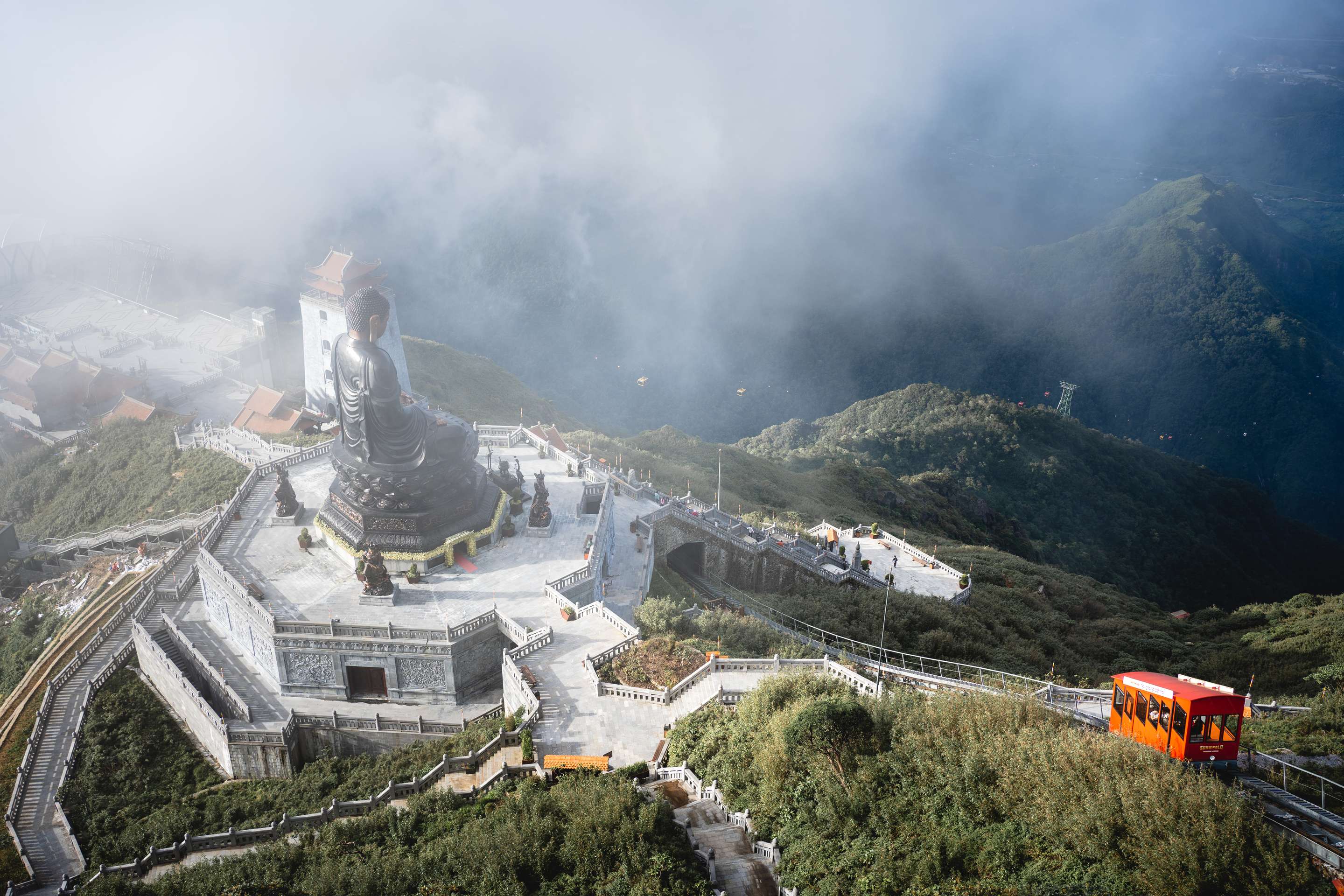 By Cable Car & Monorail: To reach Fansipan Peak you will need to do a break journey, including a monorail and a cable car ride. From Sapa, you will need to take a monorail which will drop you off at the Fansipan Legend Cable Car Station in approximately 10 minutes.