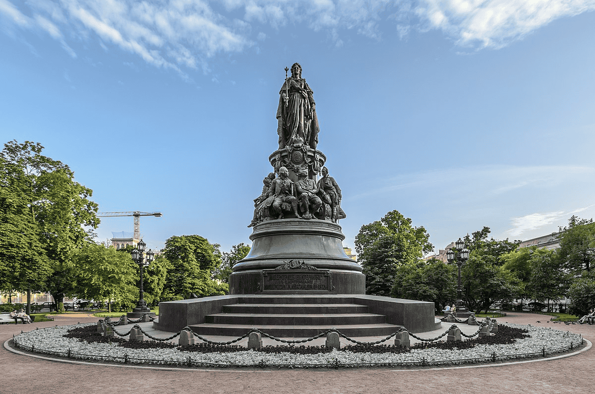 Designed by the sculptor Mikhail Mikeshin and architect Yuri Dmitriev, the monument features a central statue of Catherine II in full imperial regalia, holding her scepter and orb, symbolizing her authority. The Empress is surrounded by statues of the four founders, who are depicted in dynamic poses, each with distinctive attributes reflecting their contributions to the city’s development.