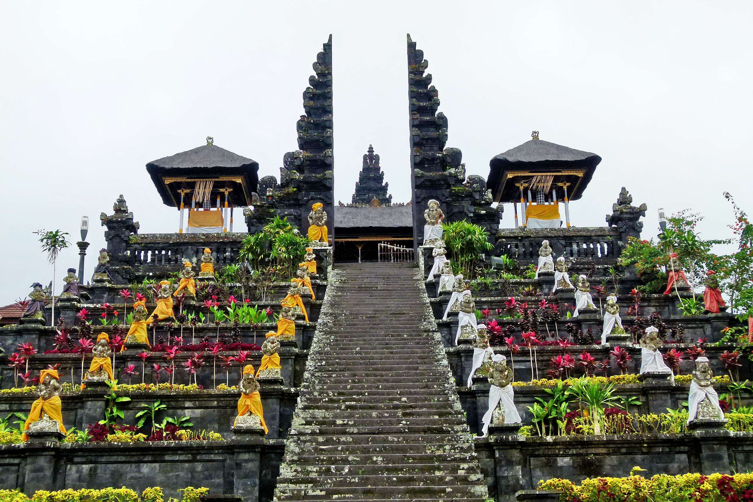 Pura Penataran Agung located in the center has white flags for Shiva, the destroyer; Pura Kiduling Kreteg located on the right has red banners for Brahma, the creator; and Pura Batu Madeg located on the left has black banners for Vishnu, the preserver. All three combined signifies the Hindu trinity in Pura Besakih. Many more minor temples in Pura Besakih can be visited, although many of its inner courtyards are only accessible to pilgrims.
