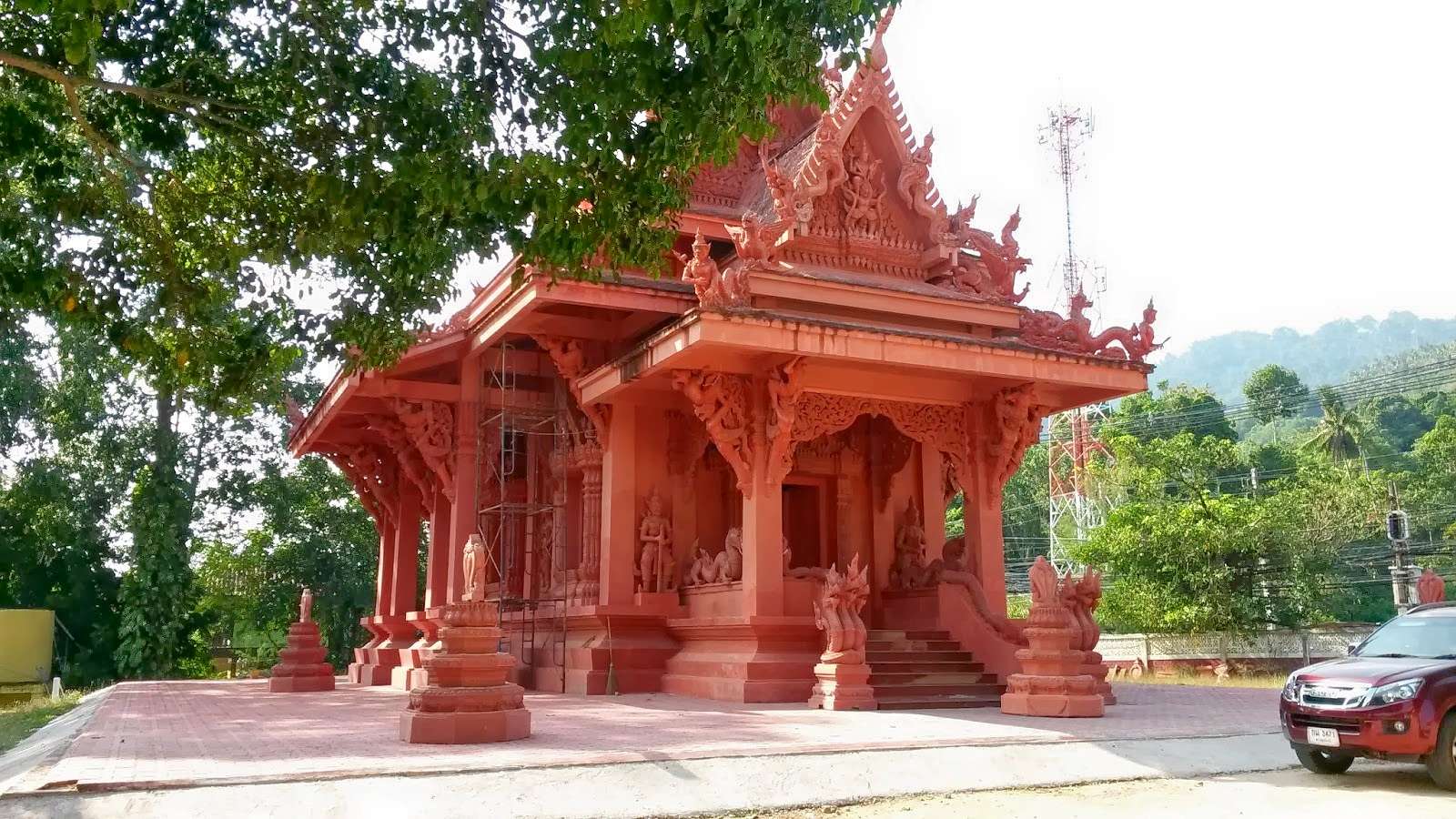 Highlights - Red colored temple complex, beach views, Buddhist architecture, tranquil settings
