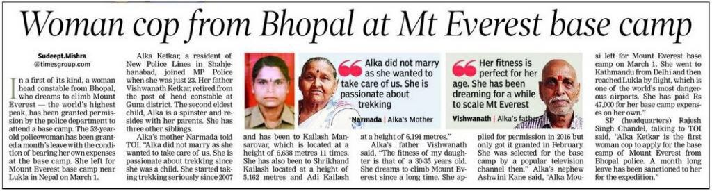 Alka Ketkar, a 52-year young female constable serving in the Bhopal Police force got the chance to visit the Everest Base Camp in March, 2018. Alka, who relates herself very close to the religion, believes immensely in Lord Shiva and hence scaling Mt. Everest is her dream feat.