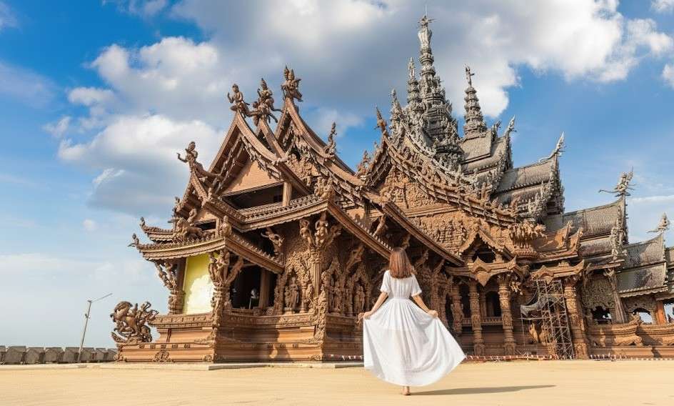 Marvel at the Sanctuary of Truth, a hand-carved wooden masterpiece showcasing Thai philosophy, spirituality, and architectural brilliance.